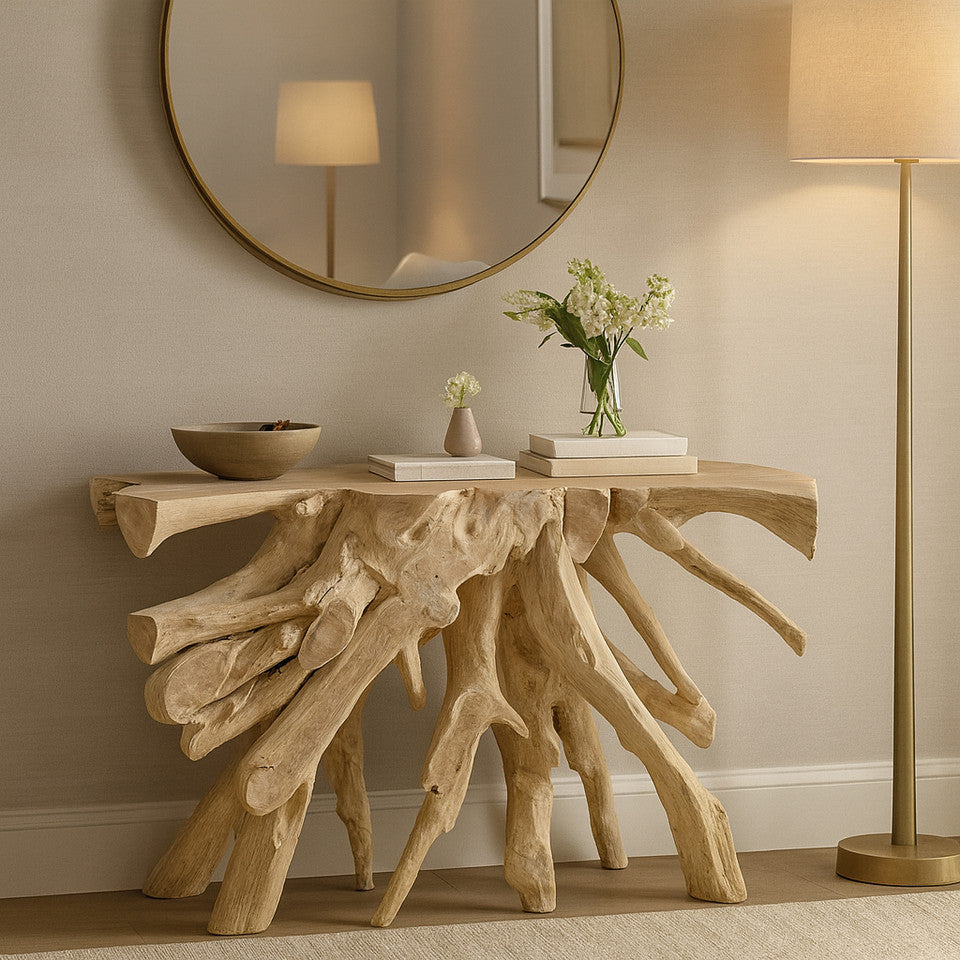 Crafted in natural teakwood, this console table brings an organic, collected feel to upscale interiors with its warm tone and sculptural character. It works beautifully in an entry, hallway, or behind a sofa, adding refined texture and a grounded presence.